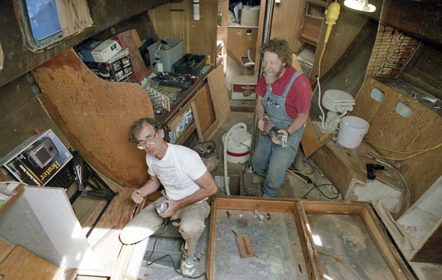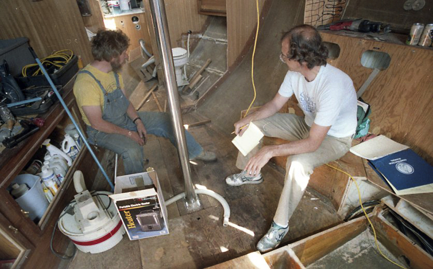 We bought our unfinished Westsail 42 in 1993 and immediately started tearing out the interior. Six months later, we drove it to Union Point Marina on the estuary and moved aboard amid epoxy, sawdust, raw fiberglass, and utter lack of amenities.