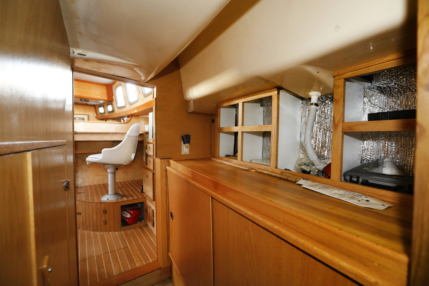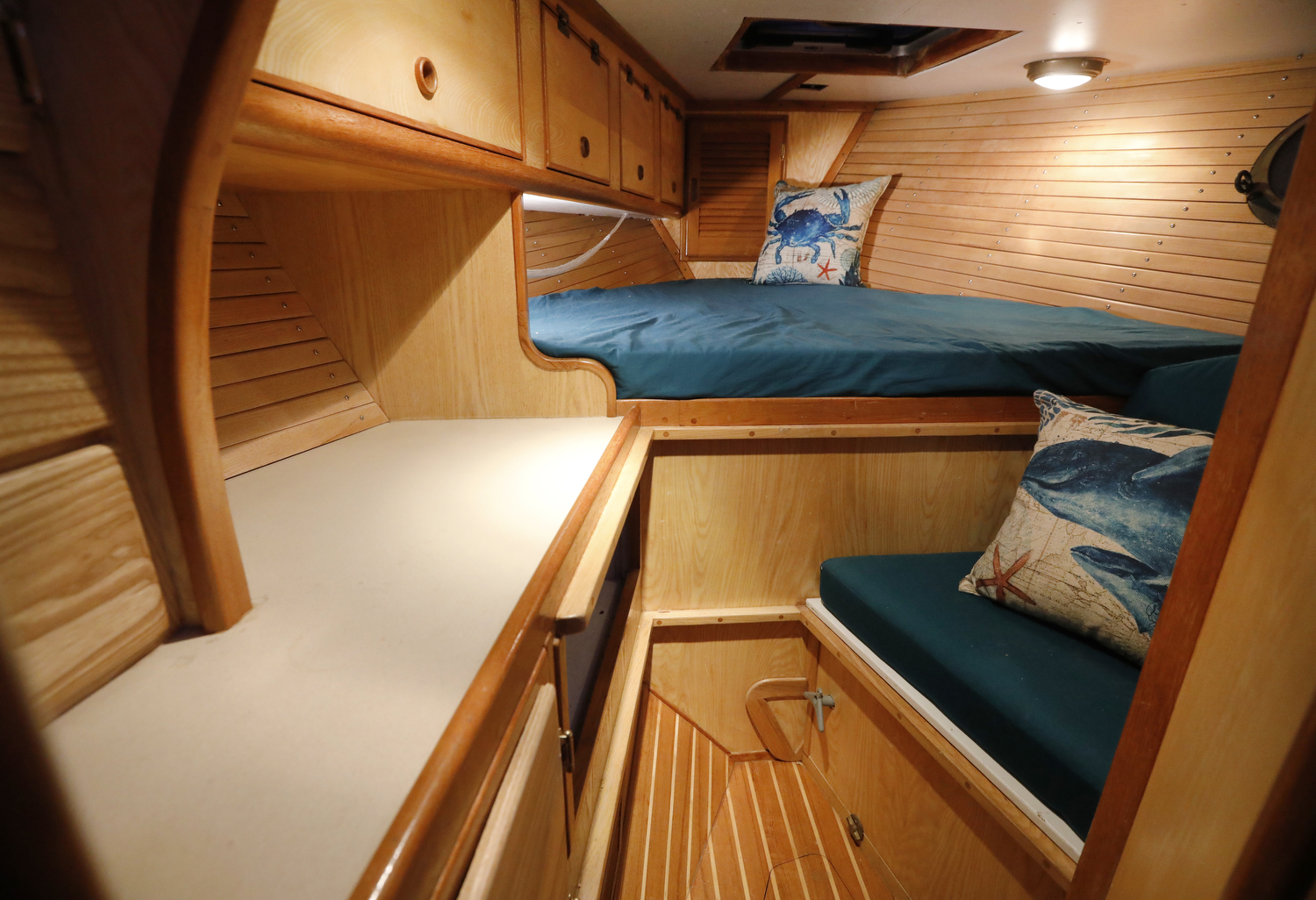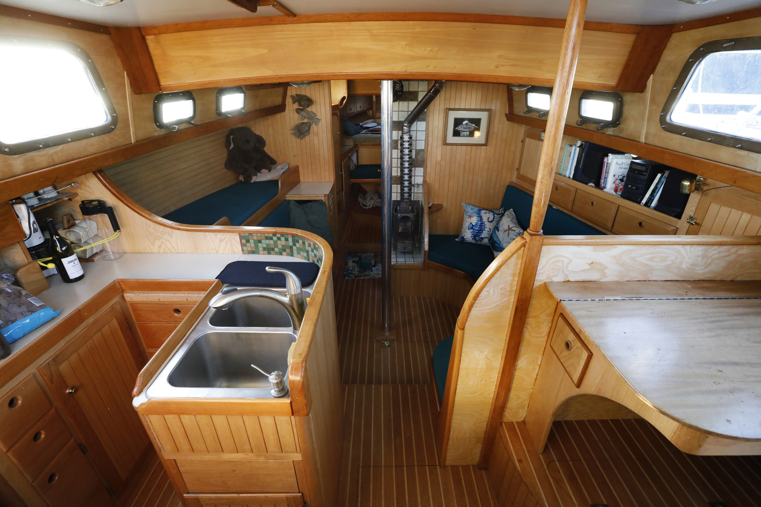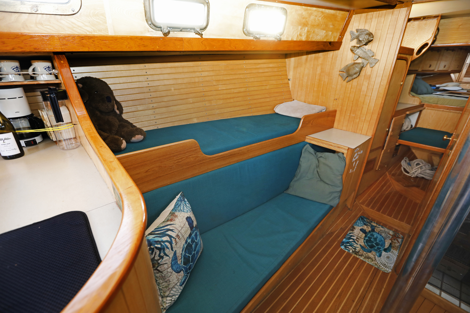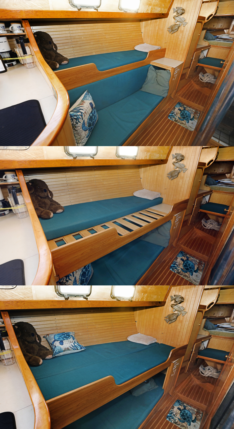 We visited (and sometimes snuck aboard) dozens of sailboats for inspiration in the design of our interior. The result is a custom set of features unlike any other W42 – such as the emphasis on curves (check out the teak companionway hand rails), swing-out desk in the aft cabin, slide-out port berth in the main cabin, and multiple-option forward settee/seat/double berth.
