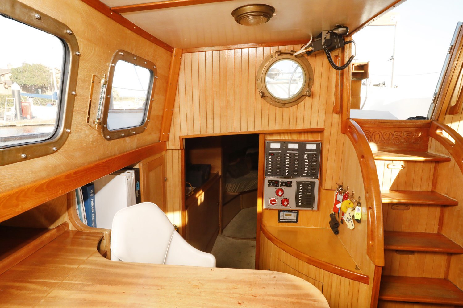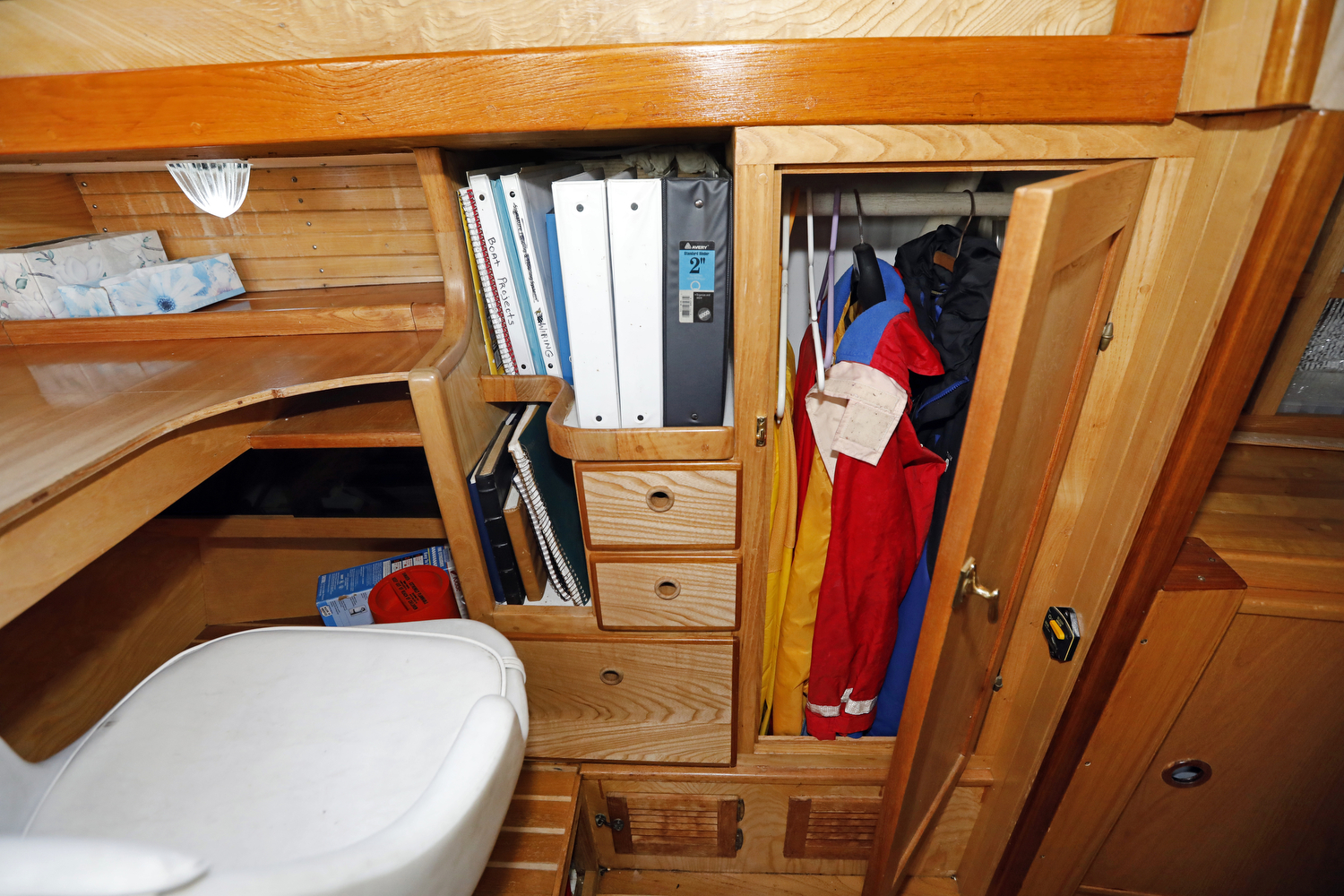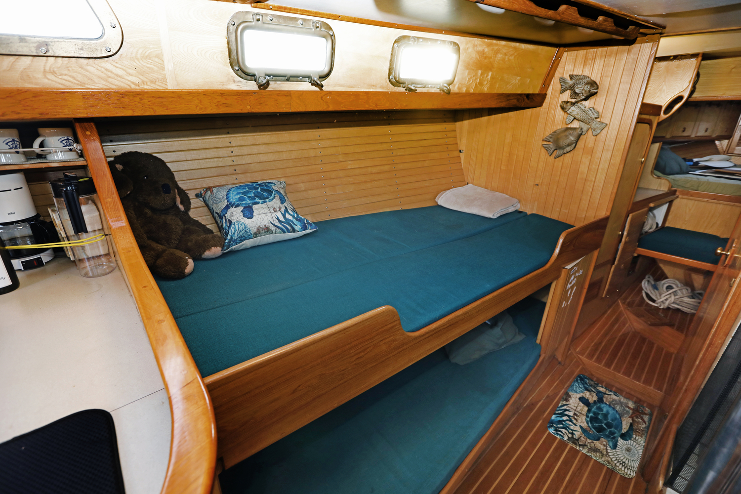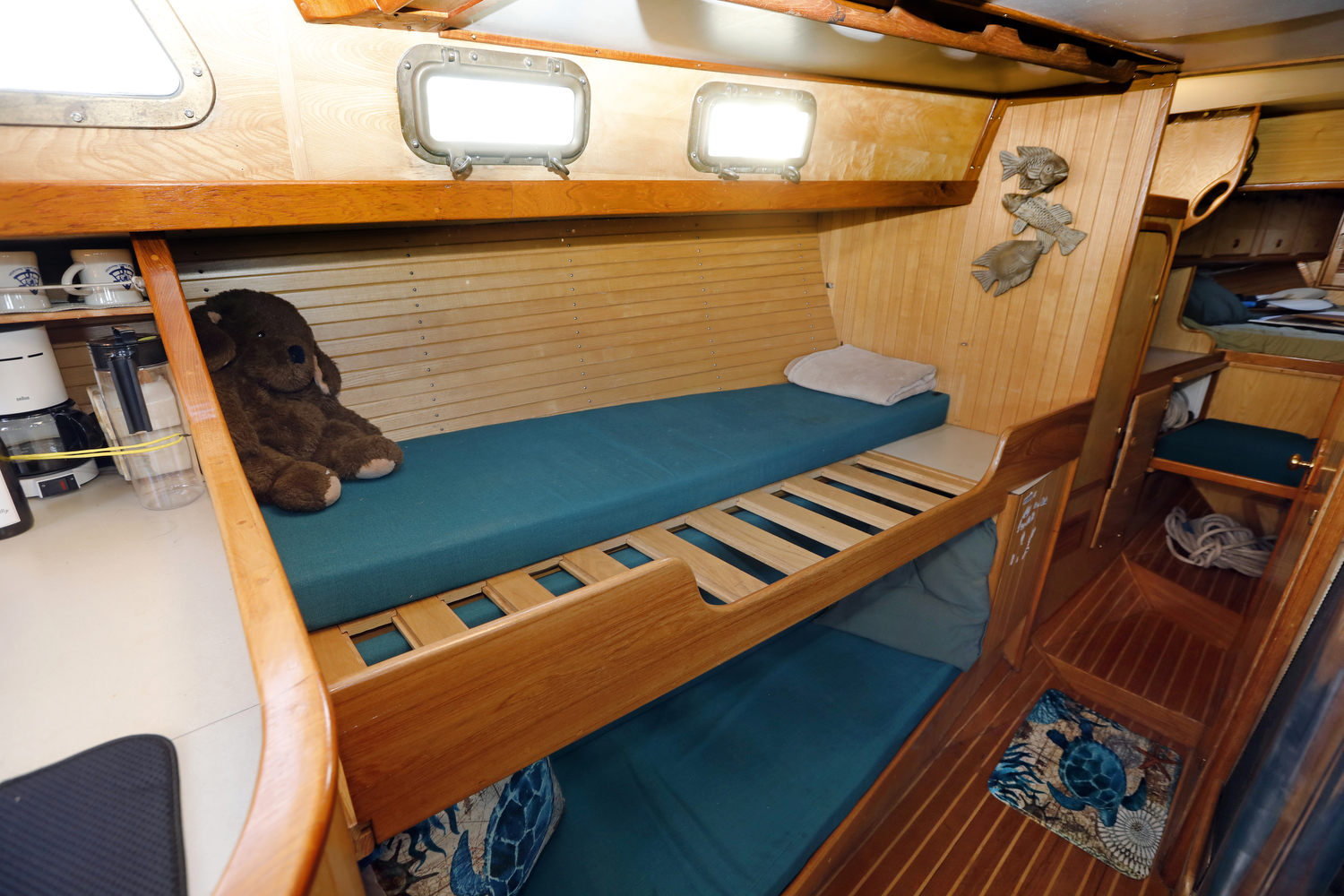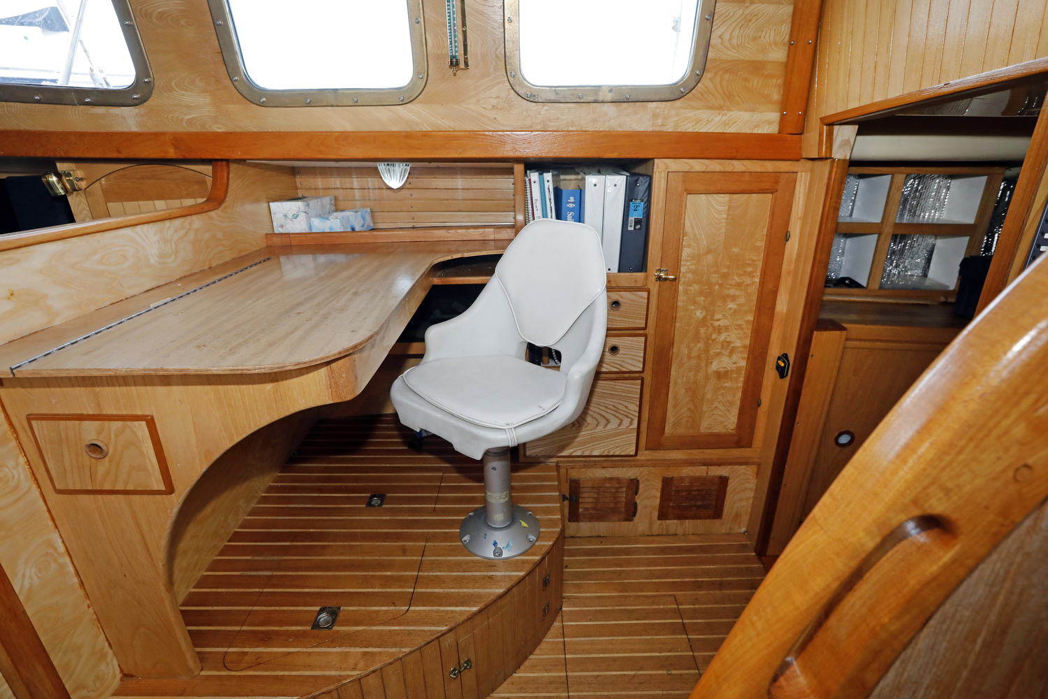 We visited (and sometimes snuck aboard) dozens of sailboats for inspiration in the design of our interior. The result is a custom set of features unlike any other W42 – such as the emphasis on curves (check out the teak companionway hand rails), swing-out desk in the aft cabin, slide-out port berth in the main cabin, and multiple-option forward settee/seat/double berth.